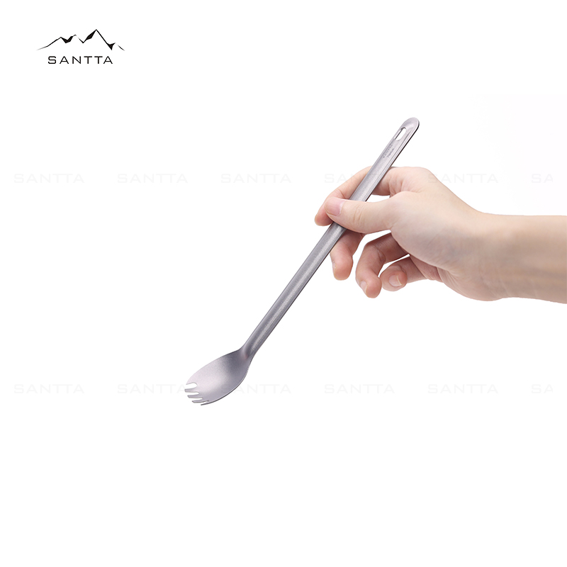 Item: Titanium Spork with Long Handle Material: TA1 titanium Dimensions: 21.5×3.8cm / 8.5×1.5inch Weight: 18.5g / 0.65oz